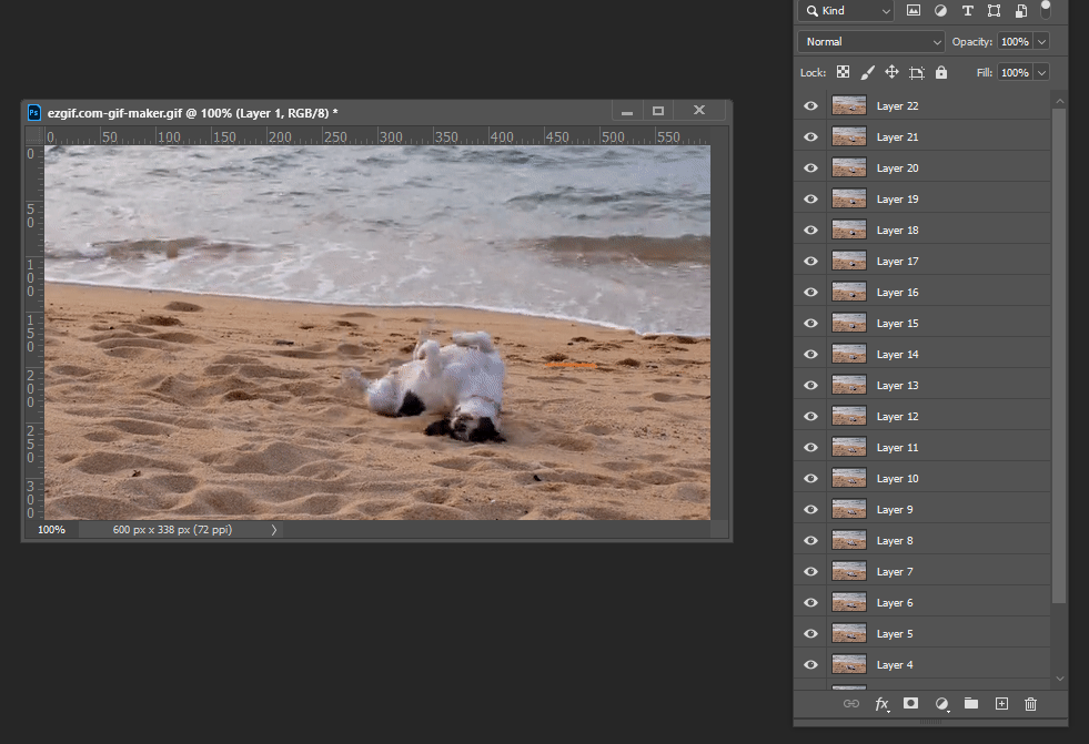 포토샵에서 22 프레임으로 수정한 GIF파일을 열어보면 22개로 분리된 레이어를 볼 수 있습니다.