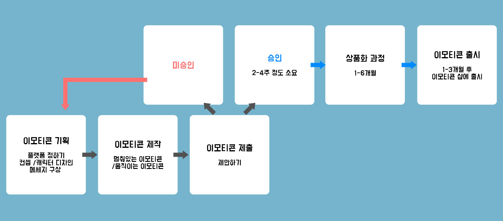 승인 후에는 카카오톡 기준으로 상품화 과정(1-6개월) 동안 회사 측의 피드백을 받으며 이모티콘을 수정하며 제작하게 됩니다. 제작이 완료되고 1-3개월 후 이모티콘 샵에 출시됩니다. 평균적으로 상품화 출시까지 6개월 정도 소요됩니다.
