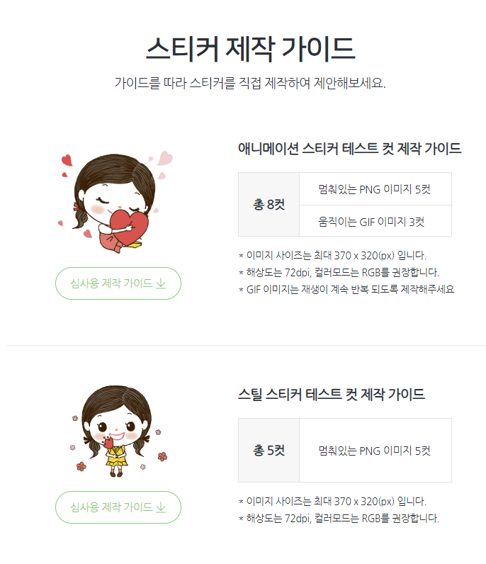 카카오톡 이모티콘 스튜디오에 들어가면 상단에 제안 가이드를 확인할 수 있습니다.