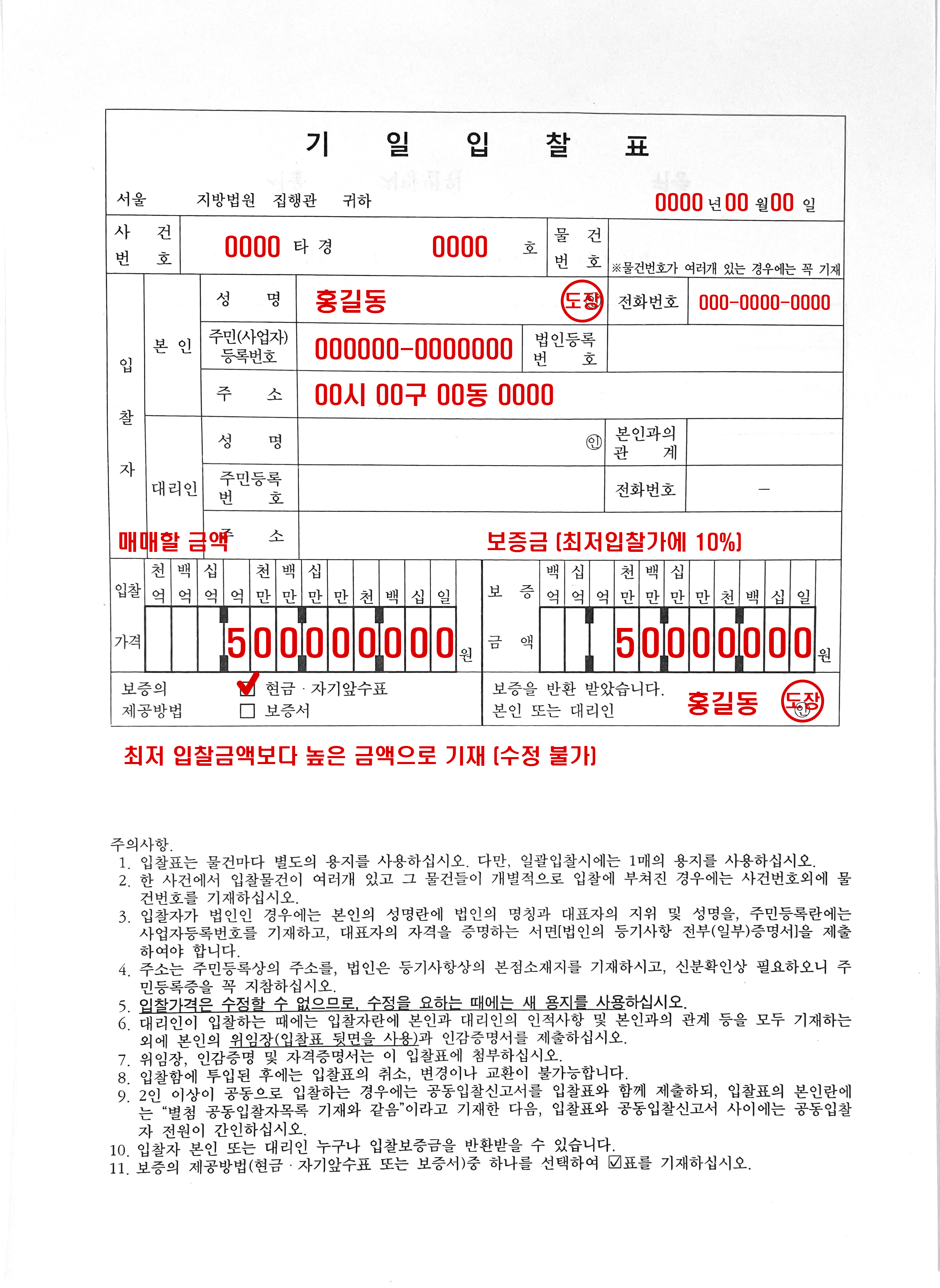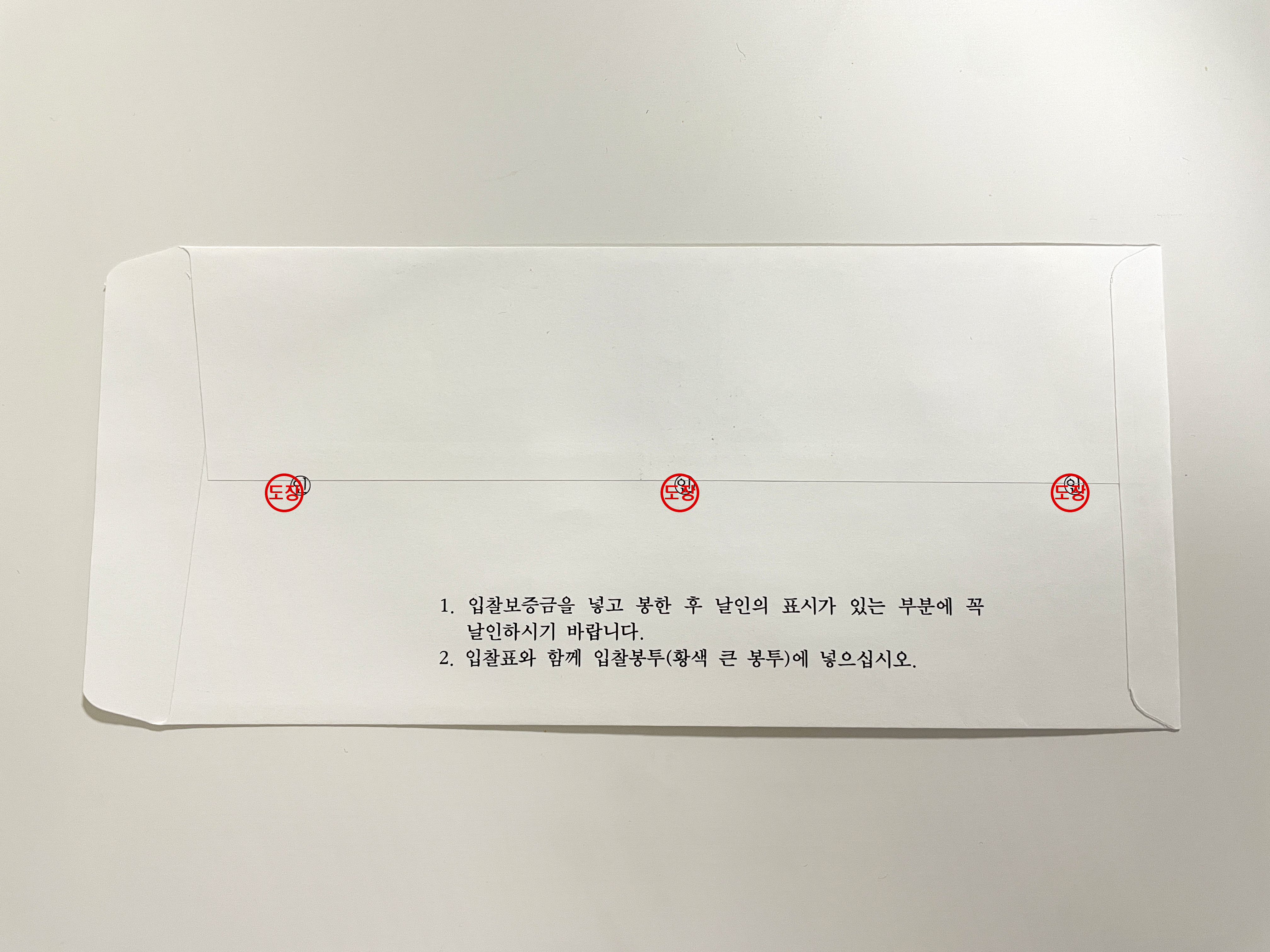 보증금 봉투에 준비된 보증금(최저가의 10%에 해당하는 금액)을 넣고 위와 같이 작성 후 날인 합니다.