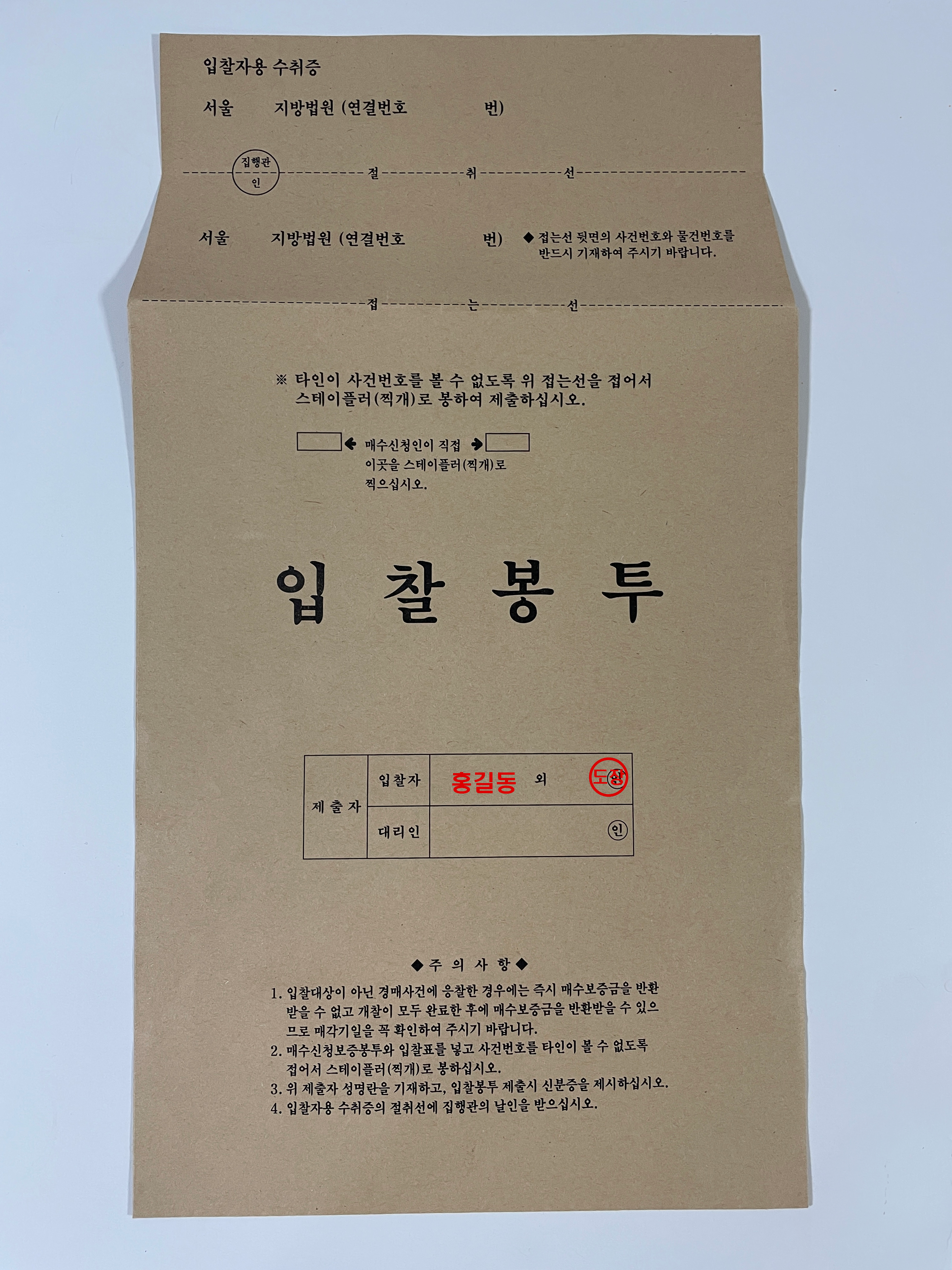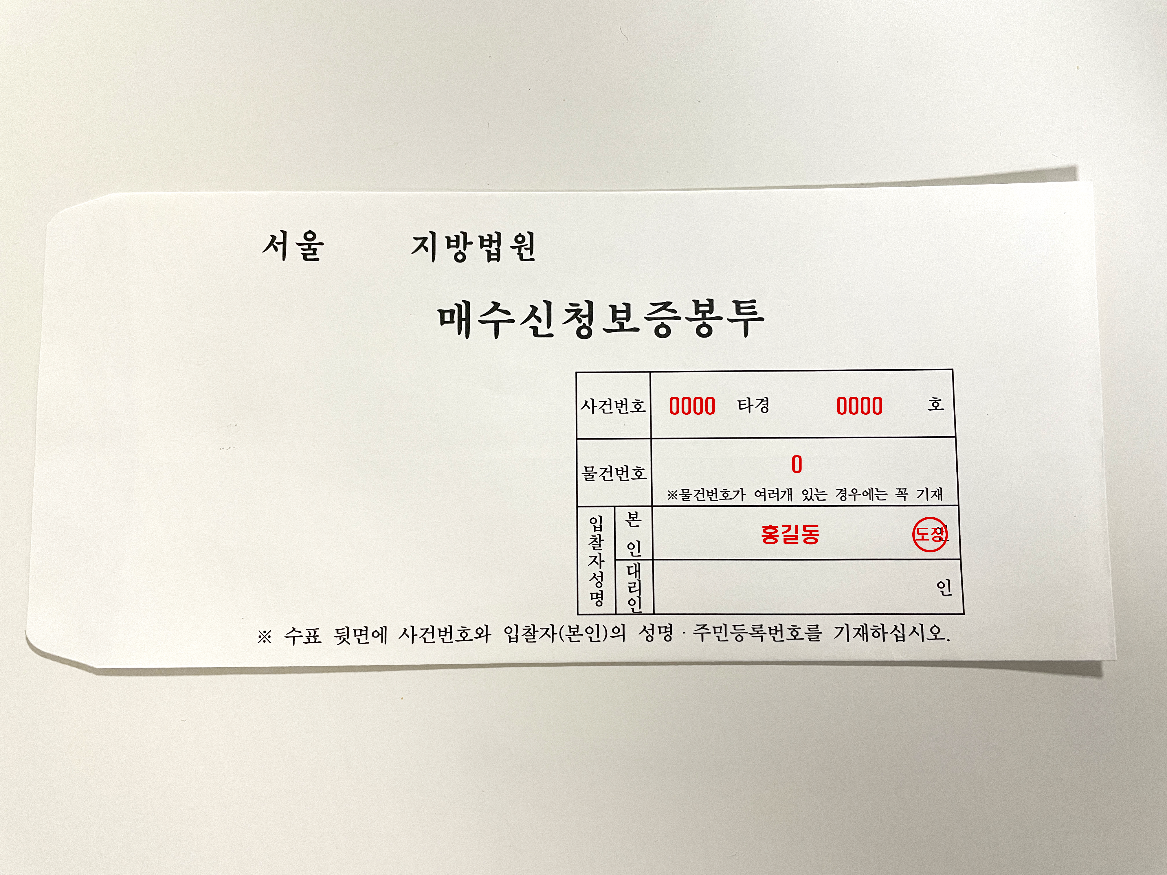 입찰 봉투에도 이름, 사건 번호, 물건 번호 등을 기재합니다.