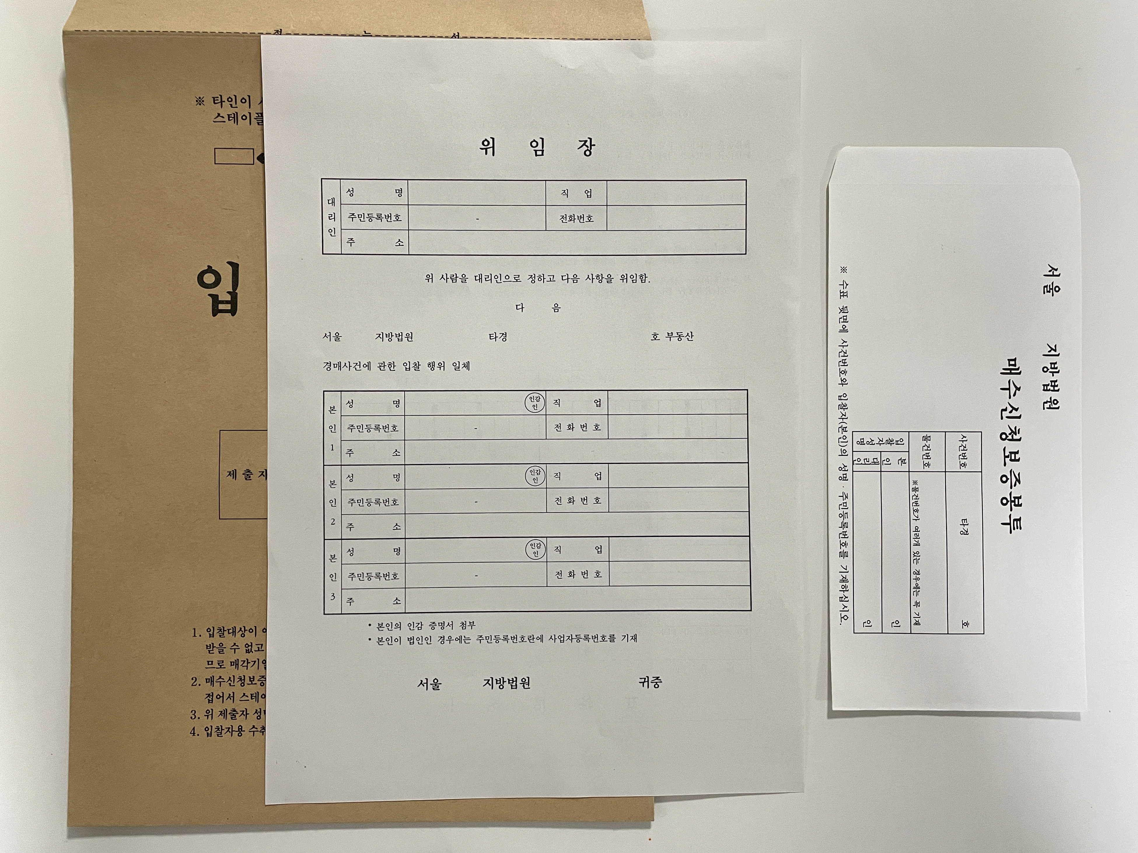 입찰자는 법원에서 제공하는 입찰봉투와 기일입찰표, 매수신청보증봉투를 받아 작성합니다.